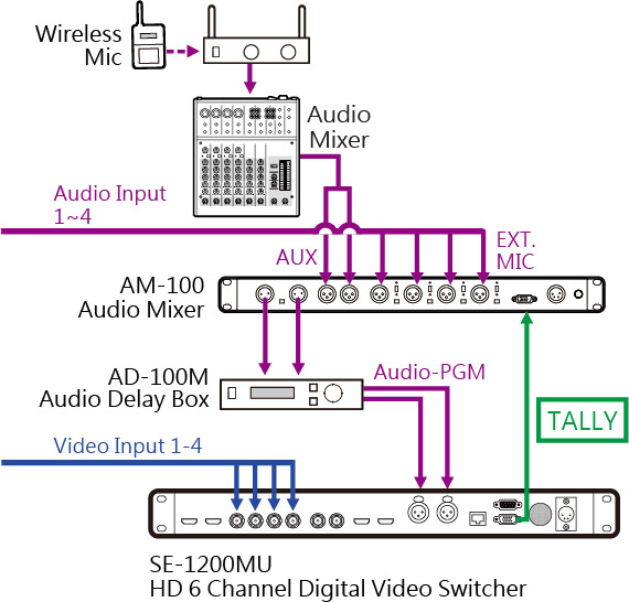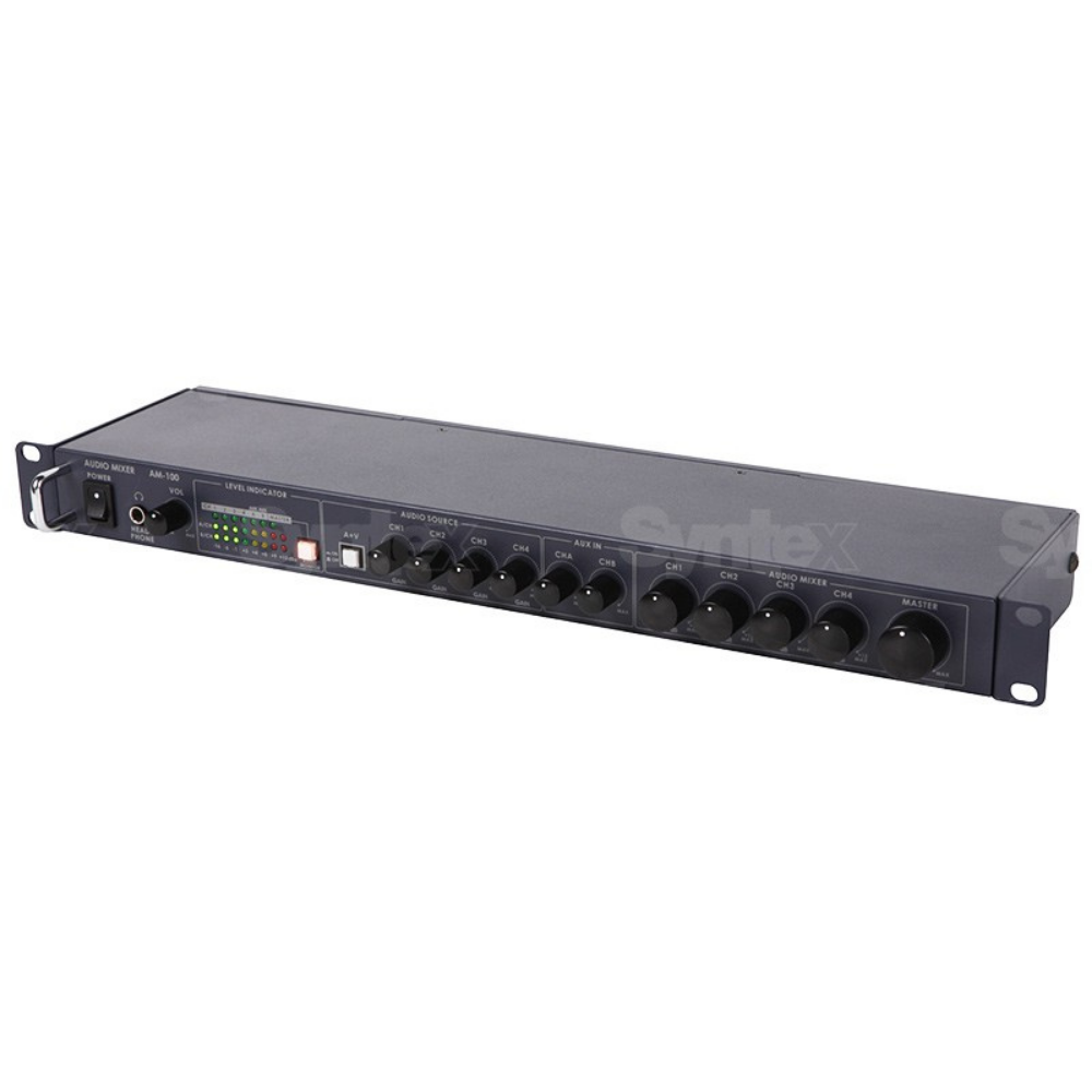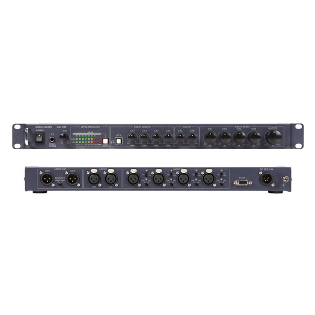 El Datavideo AM-100 es un mezclador de audio de 6 canales (4 entradas mono y 1 entrada estéreo) de 19 pulgadas y 1U de altura. Admite entradas de línea o de micrófono con alimentación fantasma y, mediante el canal AUX, es posible conectar en cadena varios mezcladores AM-100.
