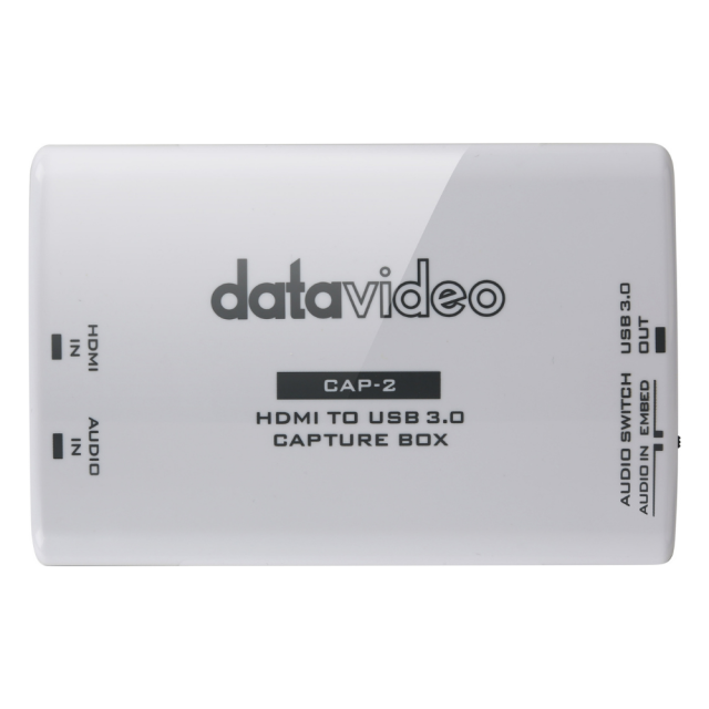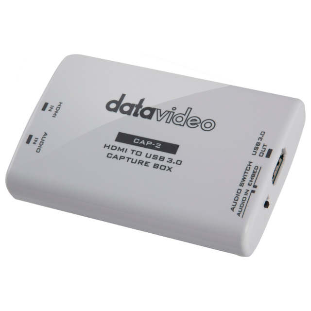 El Datavideo CAP-2 es un dispositivo HDMI > USB 3.0 UVC que permite grabar o transmitir en streaming vídeo de hasta 1080p50/60 desde dispositivos HDMI a ordenadores con sistemas operativos Windows, Linux y macOS utilizando cualquiera de las aplicaciones o servicios compatibles (OBS, VLC, Skype, etc.). Ofrece compatibilidad con audio integrado y externo, así como una instalación totalmente «plug-and-play».