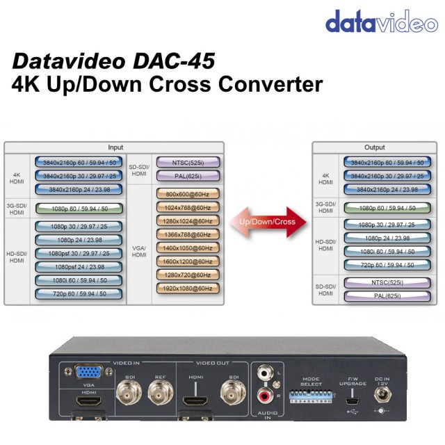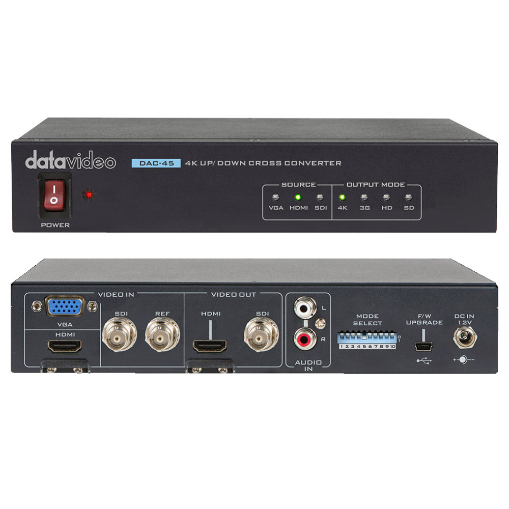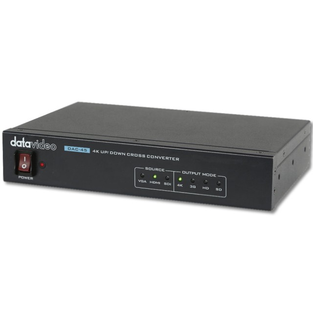 El convertidor Datavideo DAC-45 4K Up/Down/Cross Converter permite a los usuarios cambiar entre distintos formatos de vídeo y realizar conversiones de resolución ascendente o descendente, lo que permite convertir sin problemas señales de vídeo VGA, HDMI y SDI a señales 4K HDMI o 1080p HDMI/SDI. El convertidor DAC-45 incluye todas las funciones necesarias, es portátil y fácil de usar.
