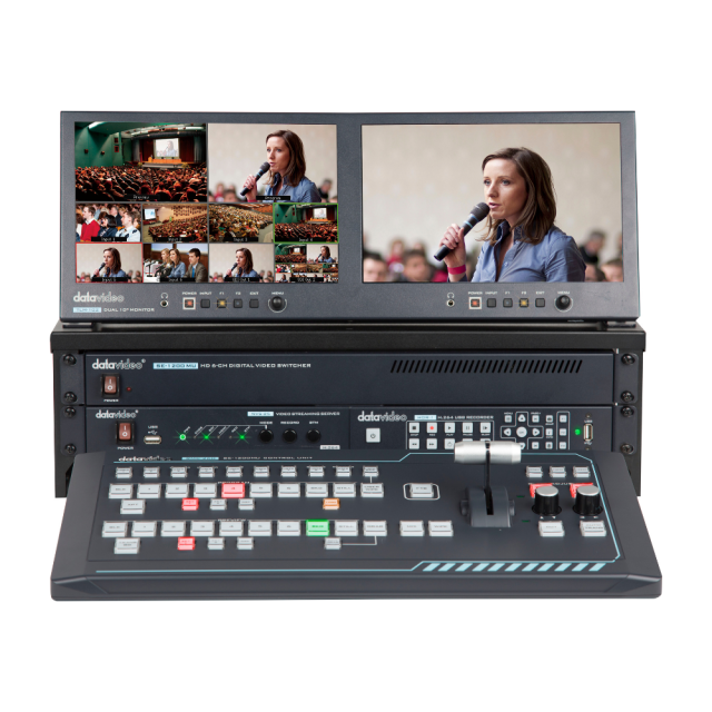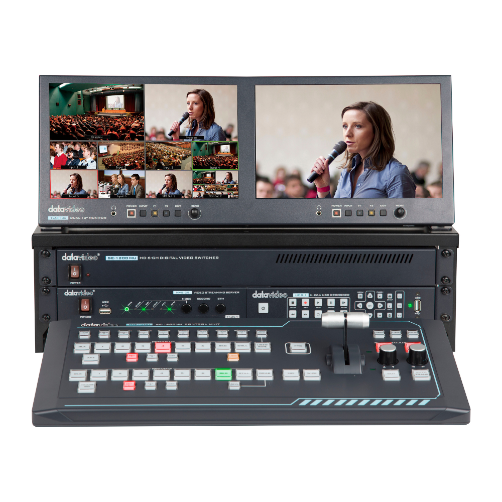 Datavideo Go 1200 Studio es una solución compacta en rack diseñada para la producción multicámara que incluye un mezclador de vídeo HD, una consola de control, un sistema de doble monitor, un codificador de streaming (streamer), una grabadora de vídeo y un maletín de transporte rígido.
