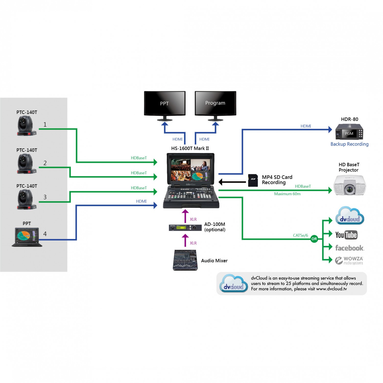 Datavideo presenta la última versión de su estación de trabajo más vendida, la HS-1600T Mark II. Esta versión Mark II incluye varias mejoras con respecto a la versión estándar. La entrada HDMI cuenta ahora con una salida pasante. Así, al conectar un ordenador o una consola de videojuegos, puede disponer de una pantalla más grande en su escritorio para ver mejor esta entrada. Esto resulta especialmente útil al trabajar con subtítulos o cualquier otra tarea que requiera una concentración absoluta. La conexión a una pantalla o un proyector mediante HDBaseT es ahora más sencilla que nunca. La salida HDBaseT integrada permite conectar cualquier dispositivo terminal con una longitud máxima de cable de 60 m y una resolución de hasta 1080p60. En cuanto a la transmisión, se ha añadido la transmisión dual, por lo que ahora puedes utilizar dos plataformas de transmisión populares directamente desde el dispositivo, siempre que dispongas del ancho de banda necesario. Datavideo sigue recomendando utilizar su servicio de transmisión dvCloud para transmitir a varios destinos a la vez, ya que así puede utilizar SRT en la nube y garantizar una imagen perfecta con baja latencia, incluso cuando el ancho de banda sea limitado.