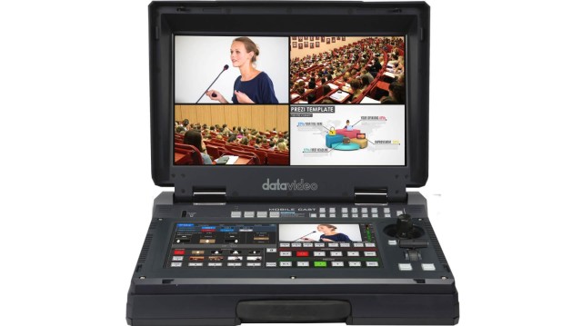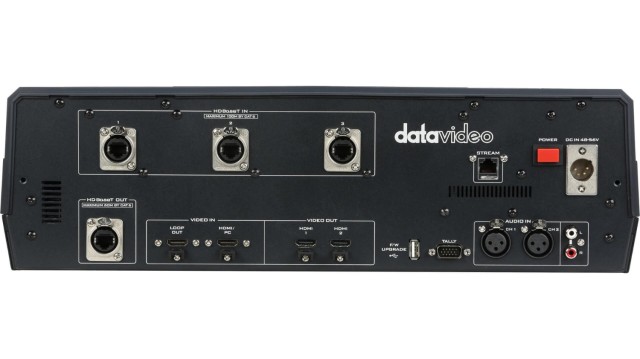 El Datavideo HS-1650T es un estudio de producción en directo HDBaseT portátil de 4 canales que combina conmutación de vídeo, retransmisión en streaming, grabación, control de cámaras PTZ y mezcla de audio en una sola unidad compacta, ideal para eventos en directo, formación y conferencias.
