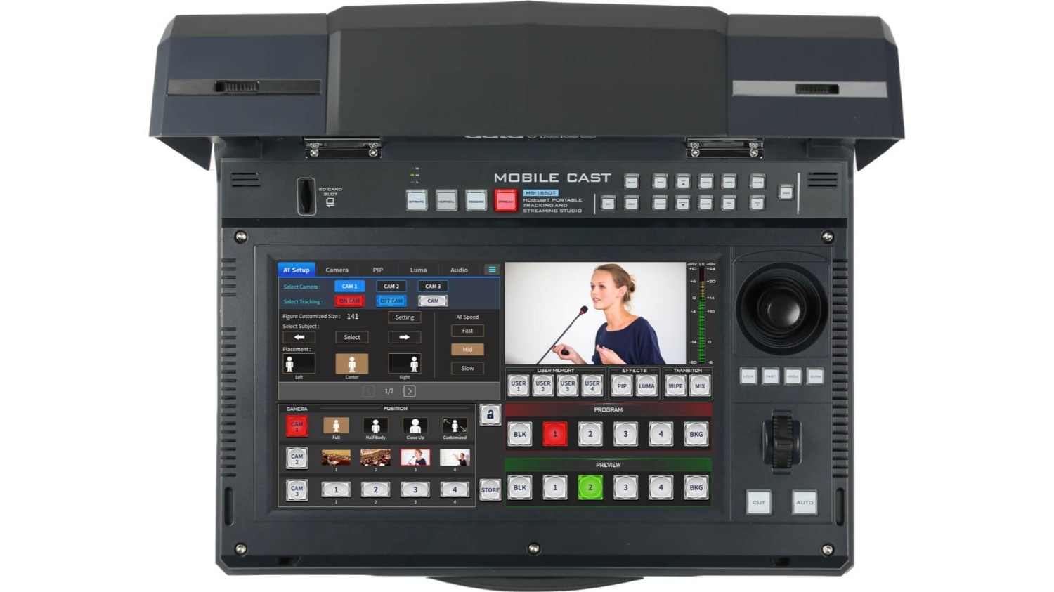 Entre las características adicionales se incluyen efectos flexibles de imagen en imagen (PIP) con tamaño, posición y borde ajustables, un monitor multivisión de 17,3 pulgadas y entradas de audio XLR/RCA para un sonido de alta calidad. Las actualizaciones de firmware mantienen el sistema preparado para el futuro sin necesidad de cambios de hardware. Ligero, portátil y robusto, el HS-1650T es tu solución completa de producción en directo en una sola maleta.