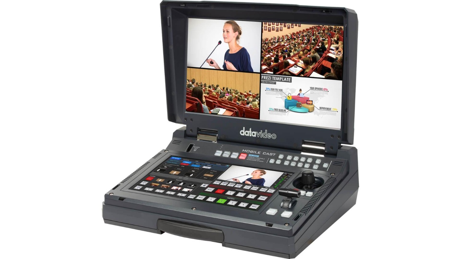 El estudio de streaming portátil Datavideo HS-1650T HDBaseT es una solución todo en uno para la producción profesional en directo. Diseñado para eventos, aulas, conferencias y retransmisiones a distancia, este robusto sistema integra conmutación de vídeo, streaming, grabación, mezcla de audio, monitorización y control de cámaras PTZ en una sola unidad compacta.