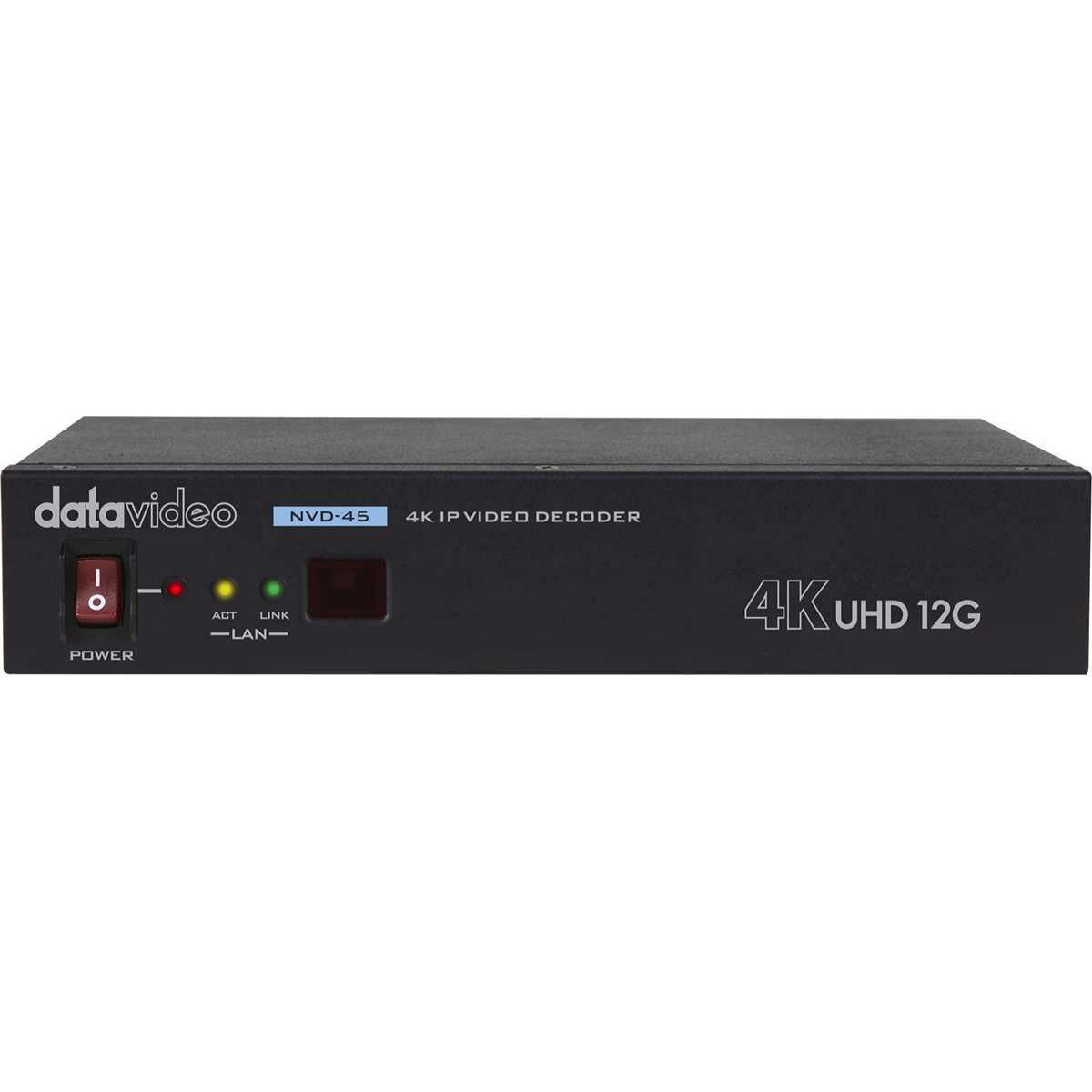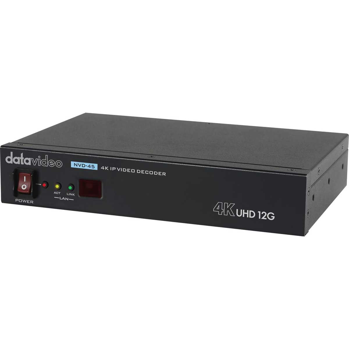 El Datavideo NVD-45 es un decodificador de vídeo IP 4K H.264/H.265 con salidas simultáneas de SDI, vídeo compuesto y audio analógico. El NVD-45 es capaz de decodificar todos los protocolos de streaming habituales, como SRT, RTSP, RTMP, HLS y MPEG-TS, y proporciona una salida de vídeo con una resolución de hasta 4096 × 2160p. El NVD-45 también puede decodificar directamente flujos de vídeo de numerosas plataformas en directo, como YouTube Live, Dailymotion y Livestream. El NVD-45 permite crear conexiones 4K punto a punto a través de Ethernet, Wi-Fi o la red pública de Internet.