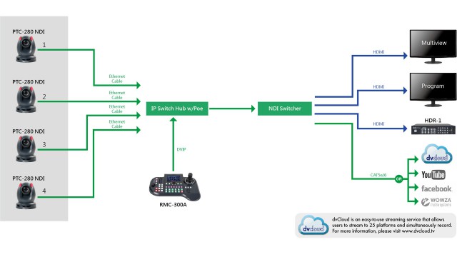 La versión NDI de la cámara PTZ 4K Datavideo PTC-280 incorpora la tecnología NewTek NDI|HX, que permite integrar la cámara en una infraestructura IP mediante un único cable Ethernet que transmite vídeo, audio, alimentación (PoE), señales de control y comandos de control remoto. Gracias a la tecnología NDI Virtual Input, la cámara también se puede utilizar fácilmente como fuente de vídeo en aplicaciones de streaming en directo, como Skype, GoToMeeting, WebEx, Zoom y otras.
