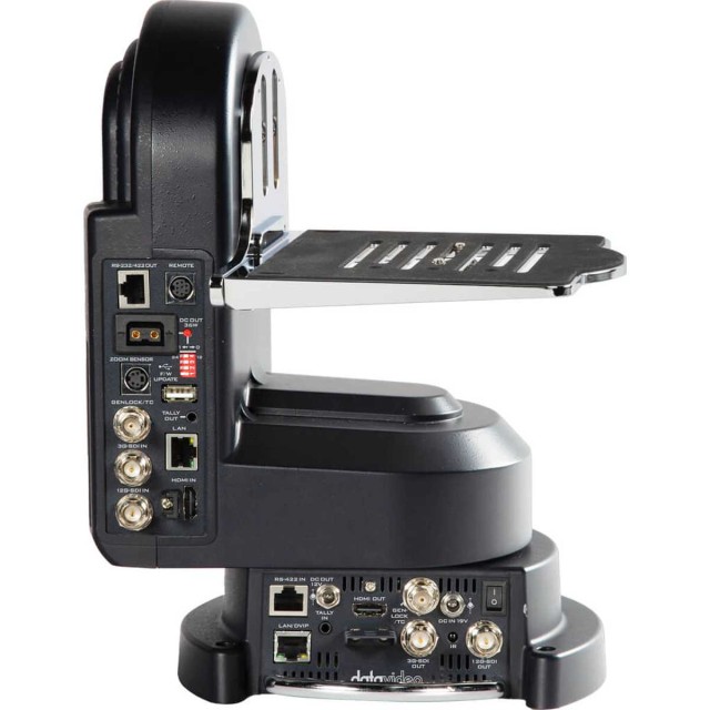 Variante PTR-15 con HDBaseT UHD. La Datavideo PTR-15 es una cabeza de cámara robótica 4K 12G-SDI con tecnología FreeD. Utiliza un eficaz sistema de control para lograr movimientos de cámara fluidos y precisos, y se puede emparejar con la mayoría de los modelos de cámaras de broadcast para controlar a distancia el giro, la inclinación, el zoom y la apertura del diafragma. El modelo PTR-15 está equipado con la función integrada de seguimiento virtual FreeD, que utiliza tecnología de visión artificial para reconocer y seguir la posición y los movimientos del sujeto filmado. El modelo PTR-15 se puede controlar mediante un mando a distancia por infrarrojos, el protocolo VISCA, el controlador Datavideo RMC-180 MARK II, el panel de control remoto universal RMC-300A y es compatible con conexiones serie y Ethernet (DVIP). El PTR-15 cuenta con una amplia gama de interfaces de señal para una integración sin problemas, incluyendo SDI, HDMI, RS-232, RS-422, DVIP, Tally (señalización) y LANC.