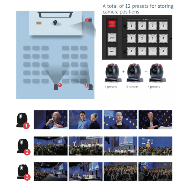 La función integrada de control remoto de cámaras permite controlar simultáneamente hasta tres cámaras PTZ, incluyendo la creación de presets (zoom, posición, etc.), el ajuste del balance de blancos, la apertura del diafragma, etc. Se pueden guardar hasta 4 presets para cada una de las cámaras, lo que da un total de 12 posiciones de cámara predefinidas. La unidad de control admite la transmisión y la grabación simultáneas de programas: se puede transmitir a hasta dos plataformas a la vez (o 25 en caso de suscripción opcional al servicio dvCloud), incluyendo servicios como Facebook, YouTube y Twitch; una característica adicional es, por ejemplo, el modo vertical para ver programas en dispositivos móviles.