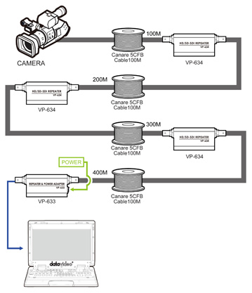 En cada cadena, el VP-633 debe ser el primer elemento, ya que cuenta con su propia fuente de alimentación y también puede enviar alimentación a través del cable SDI a los demás repetidores VP-634