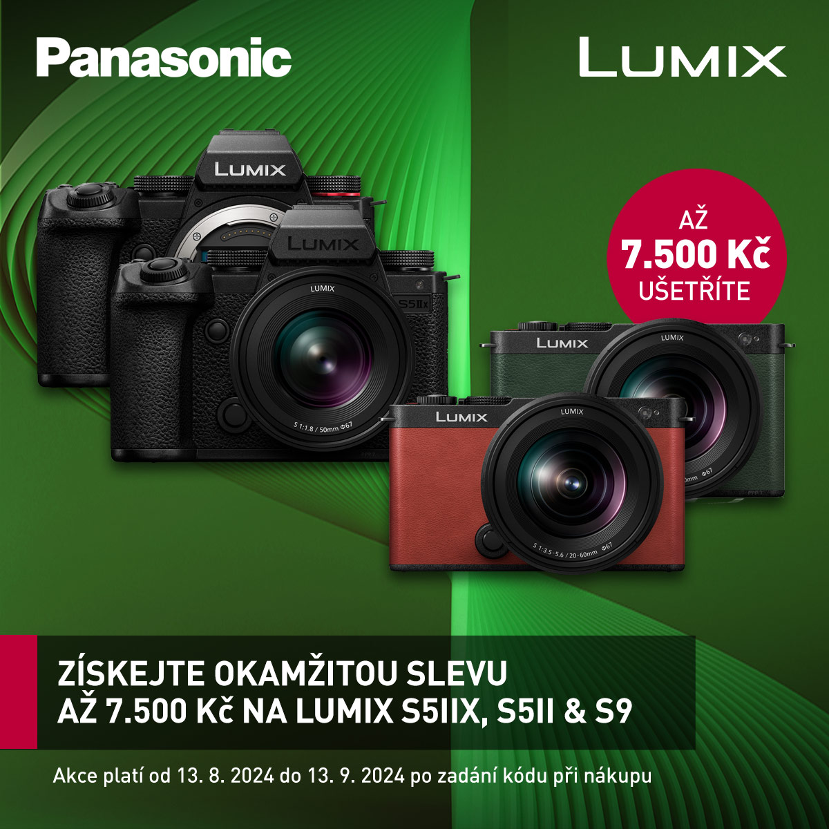Del 13 de agosto al 13 de septiembre de 2024 se aplican descuentos de 7500 CZK (IVA incl.) en los cuerpos y en cualquier kit de las LUMIX S5M2 y S5M2X, ¡y ahora también en la S9! El descuento se aplica introduciendo el código S5PROMO524 en la cesta de la compra.