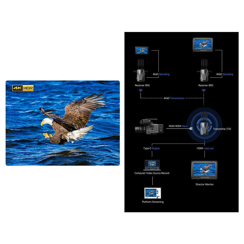 Transmisor y receptor de vídeo inalámbrico profesional Desview Atlas X 4K TX/RX para una transmisión fluida de imágenes 4K a larga distancia sin retrasos. Ideal para cineastas, retransmisiones y eventos en directo. Referencia: des-AtlasX4K-TX/RX. Diseño robusto, fácil de usar y rendimiento fiable. Mejore su producción con esta solución inalámbrica de última generación.
