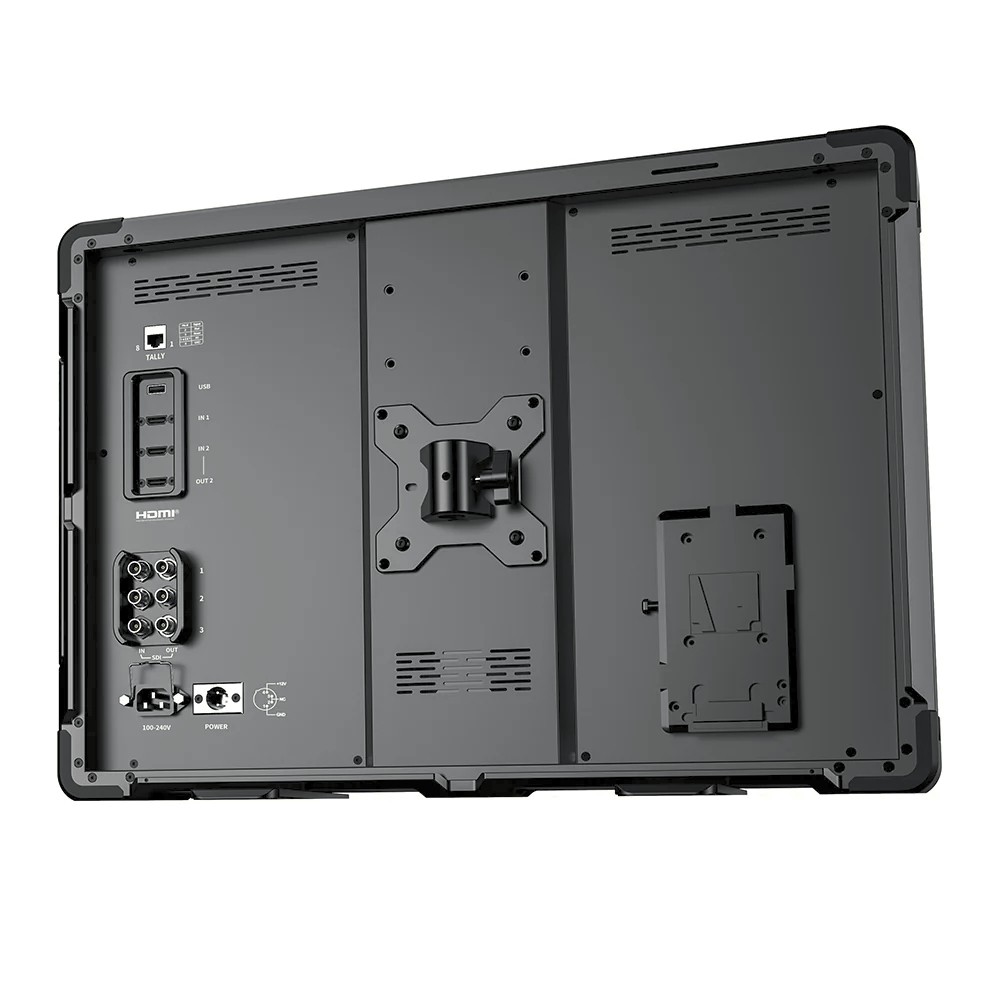El D21 Pro está diseñado para entornos exigentes y cuenta con una carcasa compuesta resistente a la presión que soporta cargas de hasta 80 kg, además de estar reforzado con protectores de esquinas a prueba de golpes de grado militar, probados para caídas desde una altura de 1,5 metros. Los múltiples puntos de montaje de 1/4"-20 y 3/8" y la compatibilidad con soportes VESA permiten una integración fluida con trípodes de iluminación, carros y equipos de estudio. La flexibilidad de alimentación está garantizada por la conexión a la red eléctrica, la entrada XLR DC o la compatibilidad con baterías V-mount, lo que lo hace ideal para grabaciones en estudio, al aire libre o móviles. El indicador luminoso de tres colores (rojo/verde/azul) situado en la parte frontal aumenta aún más su idoneidad para la producción en directo y los entornos de emisión.