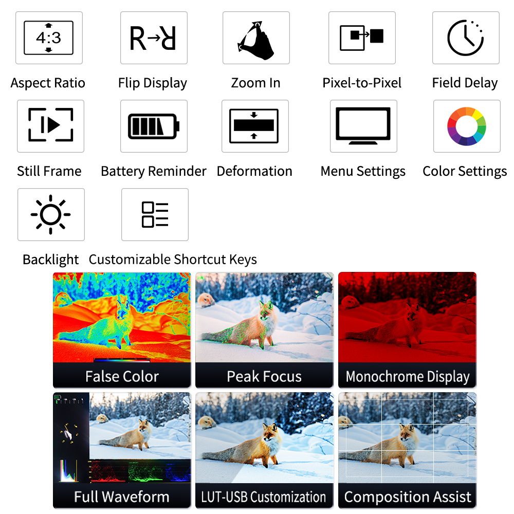 Monitor x 1 Cable A-AHDMI x 1 Cable Micro HDMI x 1 Cable D-Tap x 1 Soporte para monitor x 1 Disco U x 1 Paño para el polvo x 1 Manual de usuario x 1 |