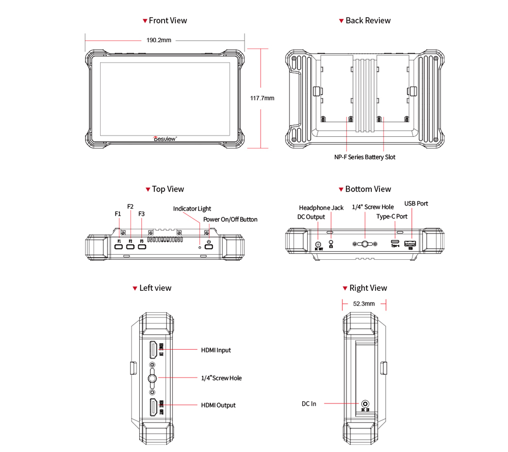 ENTRADA DE CORRIENTE CONTINUA 7 ~ 30 V / SALIDA DE CORRIENTE CONTINUA 8 V USB tipo C Ranura para batería de la serie NP-F*2 |