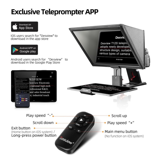 El Desview T12S es un teleprompter profesional totalmente de aluminio diseñado para cámaras réflex digitales, cámaras sin espejo, videocámaras y cámaras web, compatible con smartphones y tabletas de hasta 12,9 pulgadas de diagonal. Está equipado con un cristal de alta resolución 70/30 para la división del haz, un mando a distancia Bluetooth y una aplicación gratuita para una actuación fluida y natural ante la cámara.