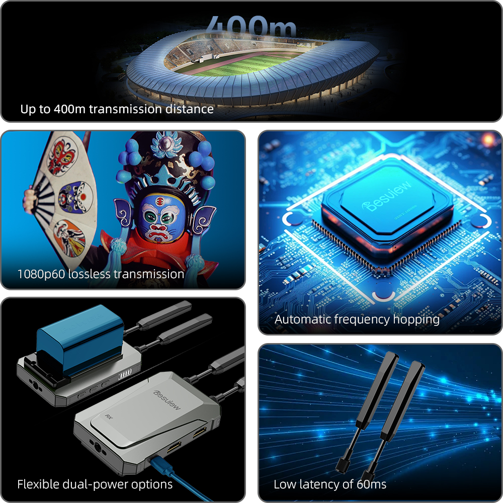 Todo en un solo puerto, configuración rápida Entrada de señal Plug-and-Play:el transmisor cuenta con una entrada HDMI y un bucle HDMI, por lo que puede conectar fácilmente una cámara o una cámara sin espejo y realizar un monitorizado local para un encuadre sencillo.