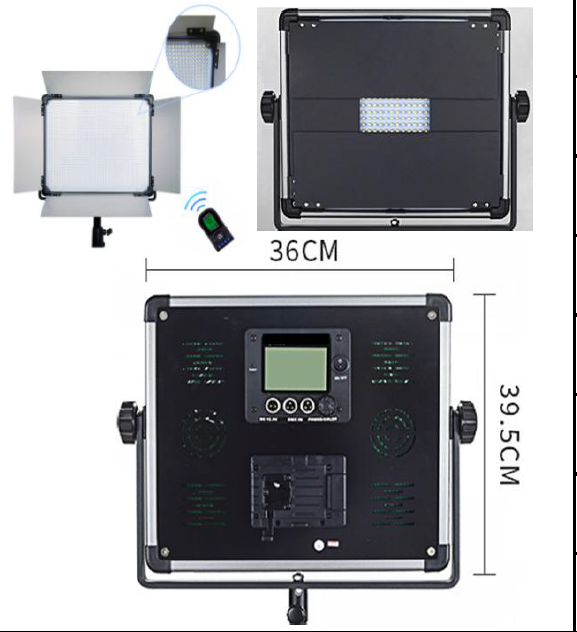 Panel de iluminación LED de 48 W, 3900 lúmenes, 97 RA. Pantalla LCD, control DMX 512, control manual, mando a distancia inalámbrico.