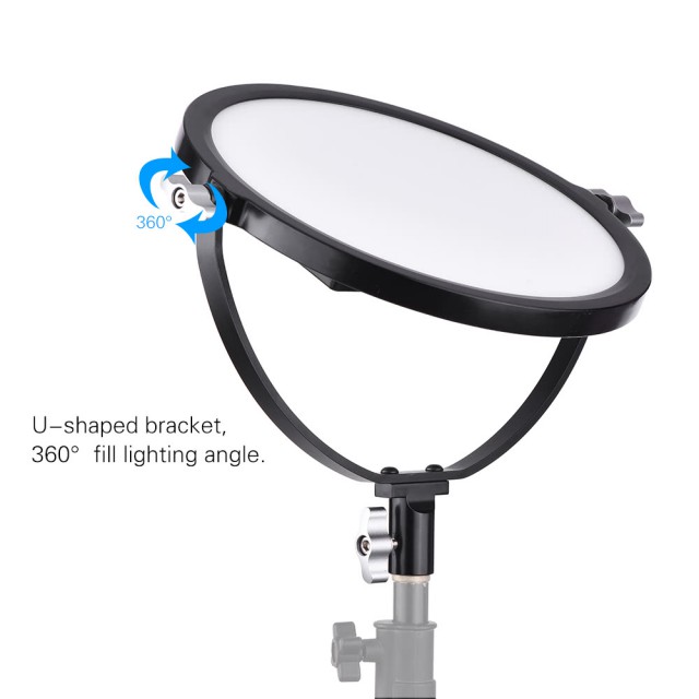 Foco circular portátil para estudio, con la posibilidad de alimentarlo mediante baterías NP-F o una fuente de alimentación de red.