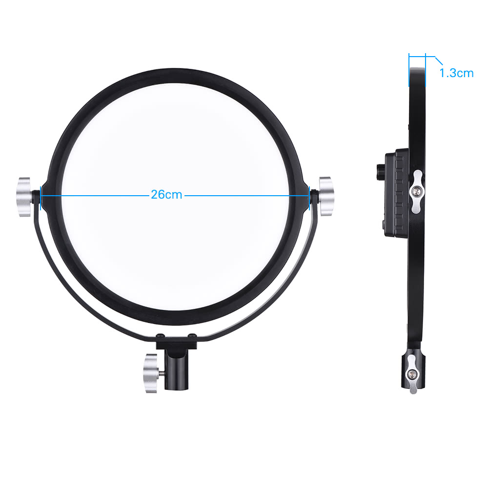 Gracias a su forma única, su CRI de más de 95 y sus opciones de alimentación y control, la luz LED-260S es una herramienta muy útil tanto en el estudio como en exteriores para diversos usos especializados. Tiene una temperatura de color de 5600 K para armonizar con otras luces o con la iluminación ambiental, o para lograr una reproducción fiel de los colores. El brillo es regulable en un rango de 0-100 %, por lo que no es necesario utilizar difusores ni mover la luz para conseguir la iluminación adecuada. El disco de luz en miniatura, con un diámetro de 10,23", tiene un grosor de poco más de 1/2", y como sus LED apenas se calientan al tacto, la luz se puede colocar en lugares donde las fuentes de luz tradicionales no llegan. La carcasa de la luz de vídeo está fabricada en aluminio aeronáutico de alta calidad, muy resistente al desgaste y con una larga vida útil. Se suministra con un adaptador de corriente de 100-240 V CA, preparado para su uso en todo el mundo, pero también puede funcionar con baterías opcionales de 7,2 V tipo NP-F si no se dispone de alimentación de red. Dado que en los lados izquierdo y derecho de la luz de vídeo hay montado un bastidor de soporte de aleación de aluminio, se pueden ajustar cómodamente diferentes ángulos de iluminación. La placa difusora de alta calidad del panel LED consigue suavizar notablemente la luz.