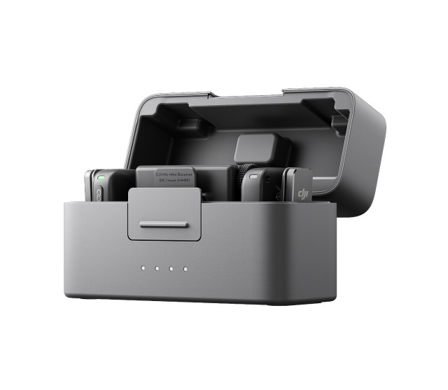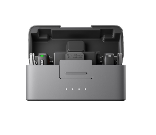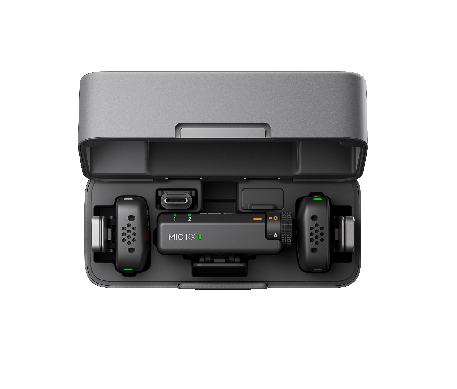 El compacto DJI Mic Mini cuenta con un diseño innovador que facilita su almacenamiento. El estuche de carga permite guardar de forma ordenada dos transmisores, un receptor, adaptadores para el móvil y protectores contra el viento. No es necesario retirar los protectores contra el viento de los transmisores al guardarlos en el estuche. Todo el conjunto es cómodo de usar y de guardar.