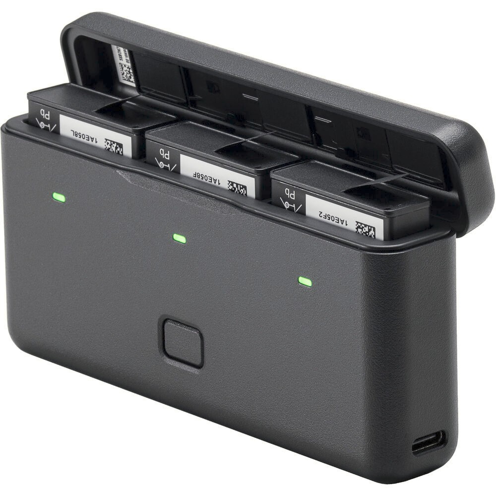 Guarda, protege y carga rápidamente hasta tres baterías para las cámaras DJI Osmo Action 5, 4 o 3 con este estuche multifuncional para baterías, que incluye un puerto de carga USB-C y un espacio para tarjetas microSD.