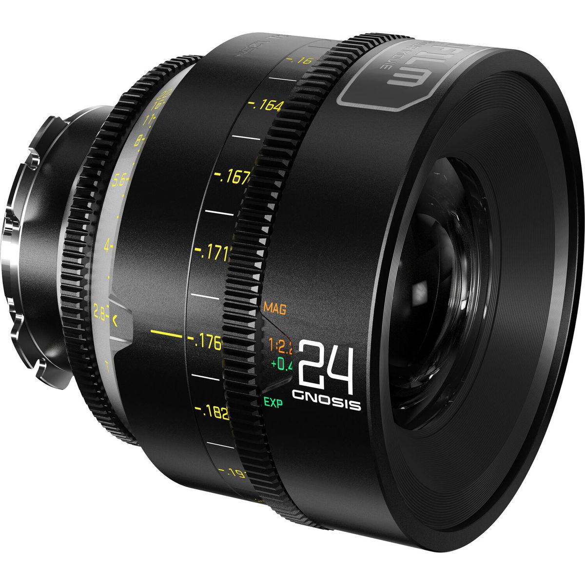 El DZOFilm Gnosis 24 mm T/2,8 combina las posibilidades de los objetivos gran angulares y macro: este objetivo cinematográfico profesional ofrece cobertura para sensores FF y VV (ángulo de campo de 83,8° y 88°, respectivamente), una distancia mínima de enfoque de 0,155 m, una imagen nítida y excelente hasta los bordes y una reproducción uniforme del color, un diámetro frontal de 114 mm para una amplia compatibilidad con soportes y otros accesorios profesionales, y un funcionamiento preciso del anillo de enfoque en un rango de 300°.