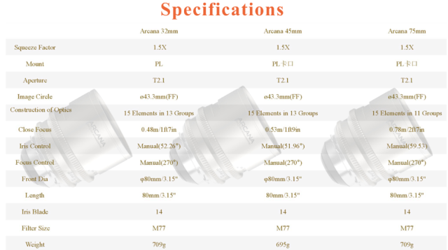 DZOFILM Arcana 32/45/75mm T2.1 Full-frame 1.5X Hybrid Anamorphic Prime 3-Lens Set (PL mount,meter)