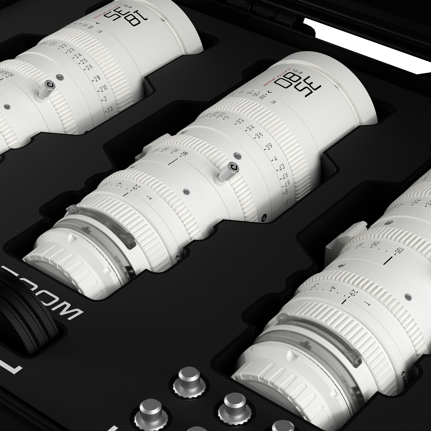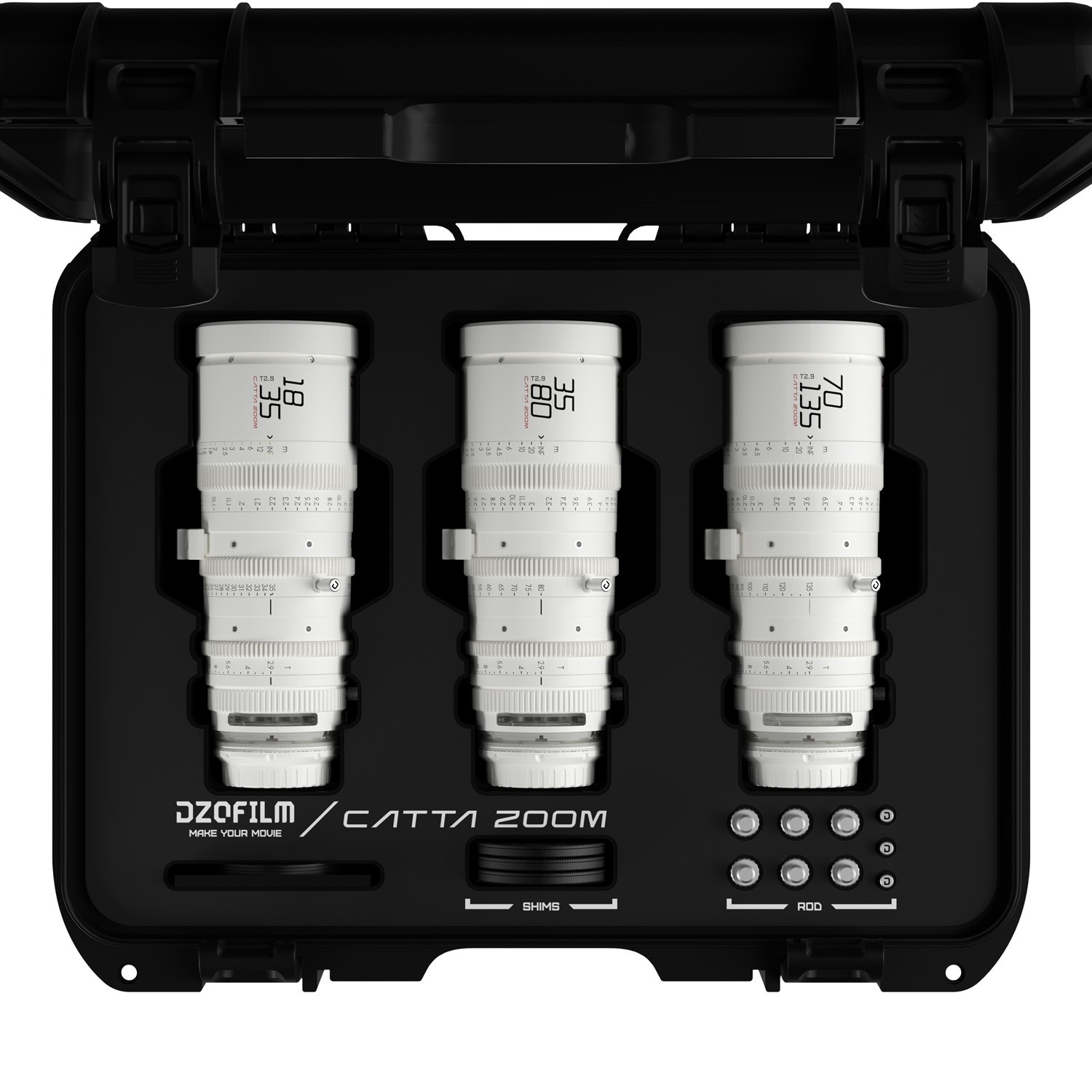 Crea tu propio conjunto completo de objetivos cinematográficos con el paquete de tres objetivos DZOFilm Catta FF 18–35 mm, 35–80 mm y 70–135 mm T2.9 Cine Zoom, en un elegante diseño blanco. Este conjunto de objetivos para formato completo cubre distancias focales que van desde el ultra gran angular hasta el teleobjetivo y está diseñado para la producción cinematográfica profesional, la publicidad, los documentales y la creación de contenido digital.