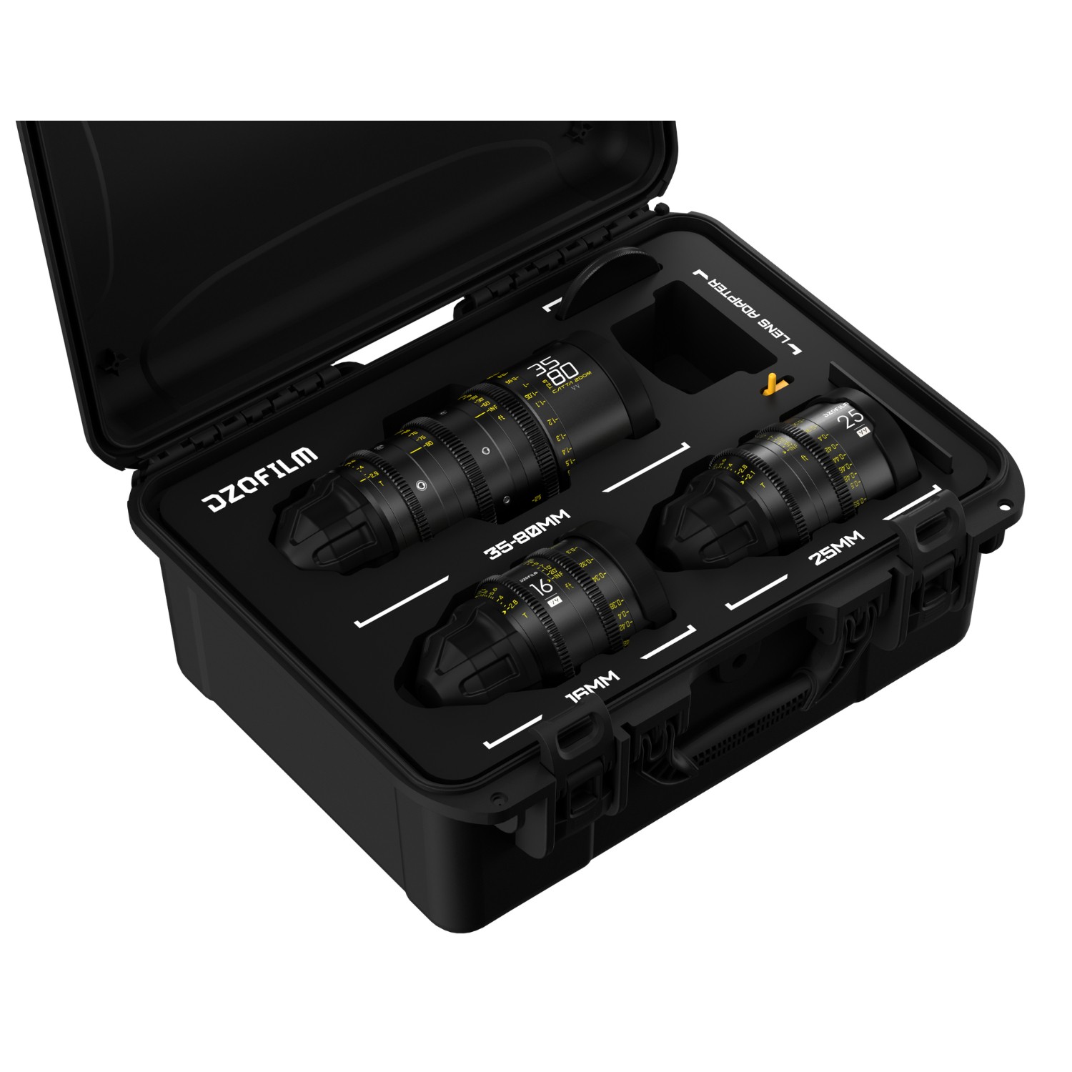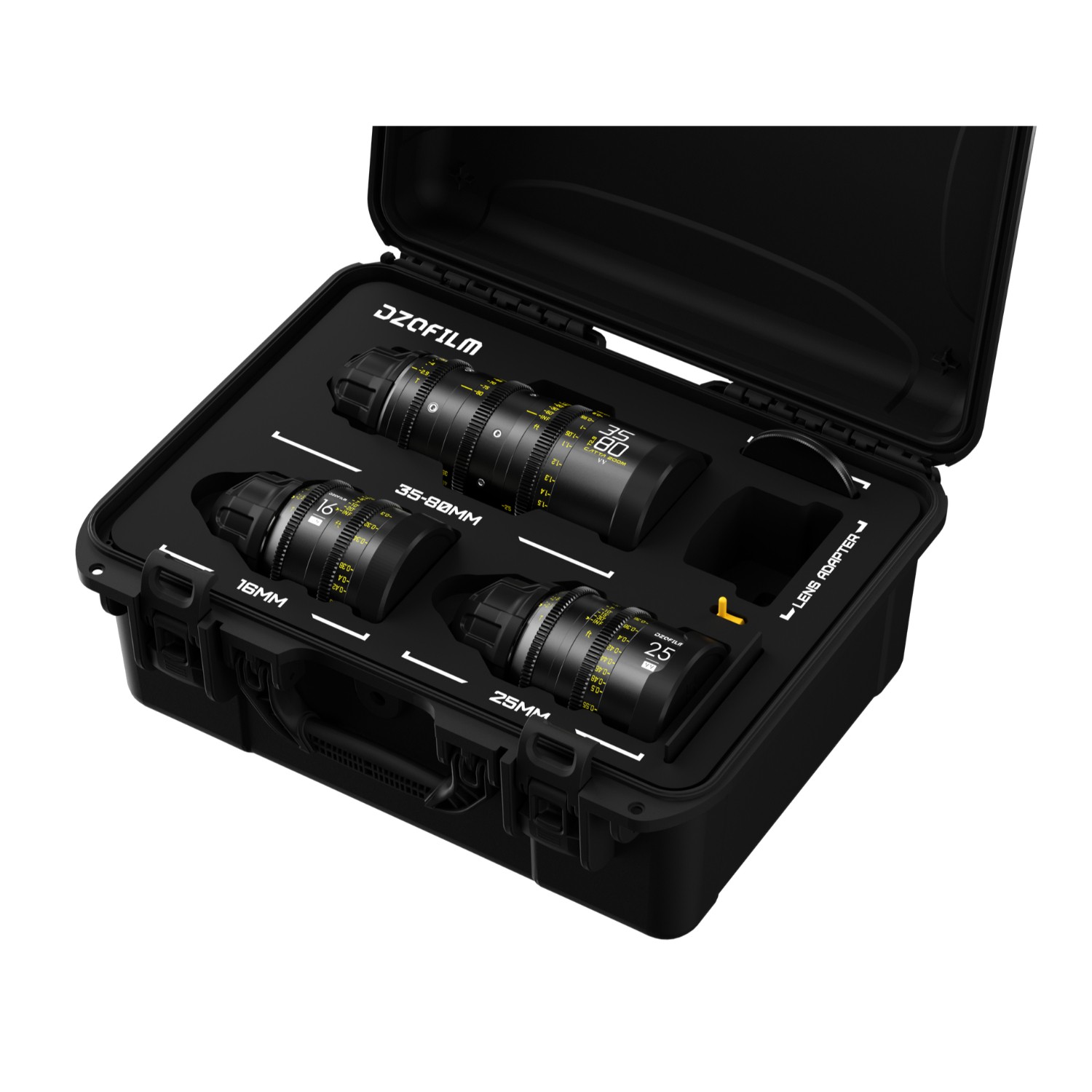 El kit incluye tres objetivos de alta gama: el Vespid 16 mm, el Vespid 25 mm y el zoom Catta Ace 35–80 mm. Ofrece una amplia cobertura de distancias focales y una calidad óptica excepcional, lo que lo convierte en la elección perfecta para la creación cinematográfica y fotográfica profesional. Es una solución fiable y potente para todos los creadores.