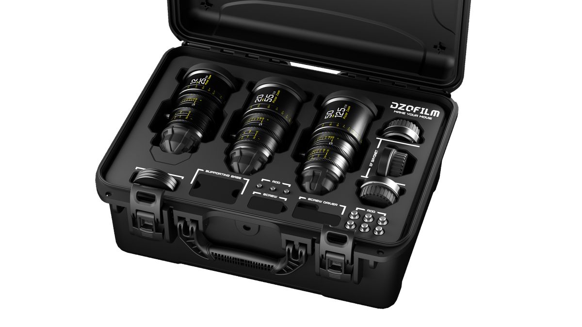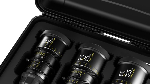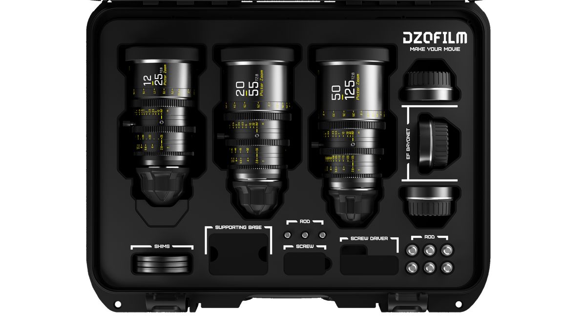 Juego de tres objetivos DZOFilm Pictor Zoom T2,8 – 12-25 mm, 20-55 mm y 50-125 mm – en maletín de transporte. Cada objetivo se suministra de serie con montura PL; también se incluye una montura Canon EF intercambiable para garantizar la compatibilidad con una amplia gama de cámaras de cine digitales.