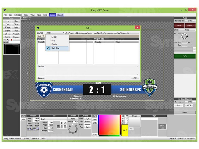 Al crear textos o párrafos completos, es posible utilizar fuentes instaladas directamente en el sistema operativo. Si dispone de fuentes TrueType de Europa del Este con diacríticos, CG las mostrará sin problemas. Puede insertar información de texto en CG directamente en la sección Designer o puede obtenerla de fuentes externas: un archivo de texto, un directorio, XML o RSS. Basta con configurar los parámetros básicos, como la ubicación del texto, la fuente, el tamaño, la alineación, el color, la transparencia y otros parámetros, y la aplicación CG tomará el contenido actual de la fuente.