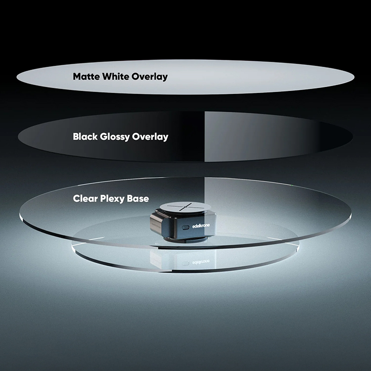 El módulo giratorio está diseñado para girar los productos de forma fluida en 360° y está disponible en tres tamaños para adaptarse a diferentes necesidades. Los modelos mediano y grande están equipados con una base de plexiglás para una mayor estabilidad.