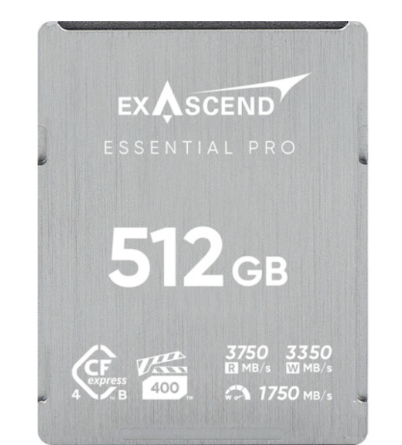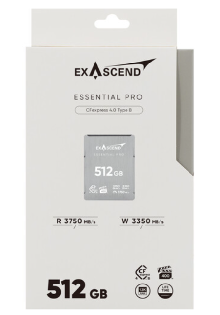 La tarjeta Exascend EXPC4EB512GB Essential Pro CFexpress 4.0 Tipo B de 512 GB ofrece una velocidad de lectura de 3750 MB/s y una velocidad de escritura de 3350 MB/s para vídeo 8K/12K a 120 fps. Certificación VPG-400 con regulación térmica adaptativa, vida útil de 300 TB TBW y garantía de por vida con recuperación de datos.