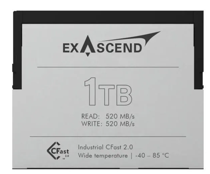 La tarjeta Exascend SD3X Series de 1 TB CFast 2.0 esuna solución de almacenamiento industrial de última generación diseñada para aplicaciones críticas que requieren una enorme capacidad y un rendimiento elevado y constante, como la grabación de vídeo en 8K RAW, la monitorización en tiempo real y los sistemas integrados de inteligencia artificial. Gracias a la tecnología 3D TLC NAND y a la interfaz SATA III (6 Gb/s), alcanza una velocidad secuencial sostenida equilibrada de 520 MB/s en lectura y 520 MB/s en escritura, lo que garantiza que no se produzcan cuellos de botella durante el flujo continuo de datos o la transferencia de archivos de gran tamaño. Funciona de forma fiable a una tensión de 3,3 V en un rango de temperaturas extremo de -40 °C a +85 °C. El formato compacto CFast (42,8 x 36,4 x 3,6 mm) es adecuado tanto para hosts antiguos como modernos.