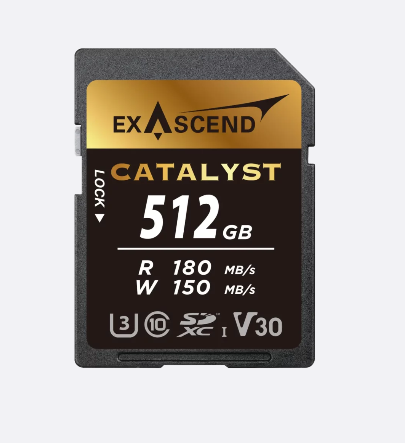 La tarjeta Exascend EX512GSDU1 de 512 GB Catalyst UHS-I SDXC cuenta con certificación V30 para vídeo 4K/8K, velocidad de lectura de 180 MB/s, velocidad de escritura de 150 MB/s, TLC 3D, resistencia a temperaturas de -25 °C a 85 °C, resistencia al agua, al polvo y a los golpes, ideal para la fotografía profesional en condiciones extremas.