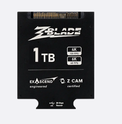 La unidad de almacenamiento Exascend EXP4M6G001TB ZBlade Gen4 de 1 TB está certificada para la Z CAM E2-F6 Pro y ofrece un rendimiento similar al de un SSD en formato de tarjeta de memoria. Ofrece una velocidad de lectura de 2400 MB/s y una velocidad de escritura sostenida de 1200 MB/s para un vídeo 8K fluido, con un lector USB de 20 Gbps, una resistencia extrema y una garantía de 5 años.