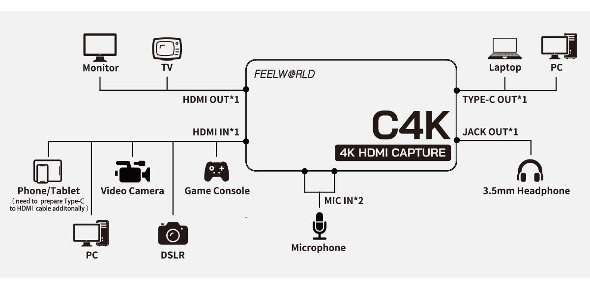 FEEWORLD C4K Video Capture: entrada y salida 4K HDMI a 60 Hz con USB-C Plug and Play
