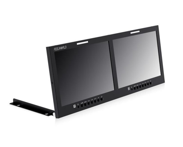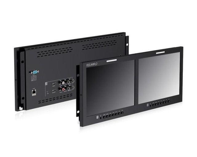 El monitor dual Feelworld D101-PLUS de 10,1" ofrece pantallas IPS Full HD de alta calidad con una resolución de 1920 x 1200 y ángulos de visión de 80/80°, ideales para un control preciso del color en el plató o en entornos de emisión. Su diseño para montaje en rack de 4RU permite una fácil instalación en paredes de televisión, unidades móviles de retransmisión o configuraciones de estudio.