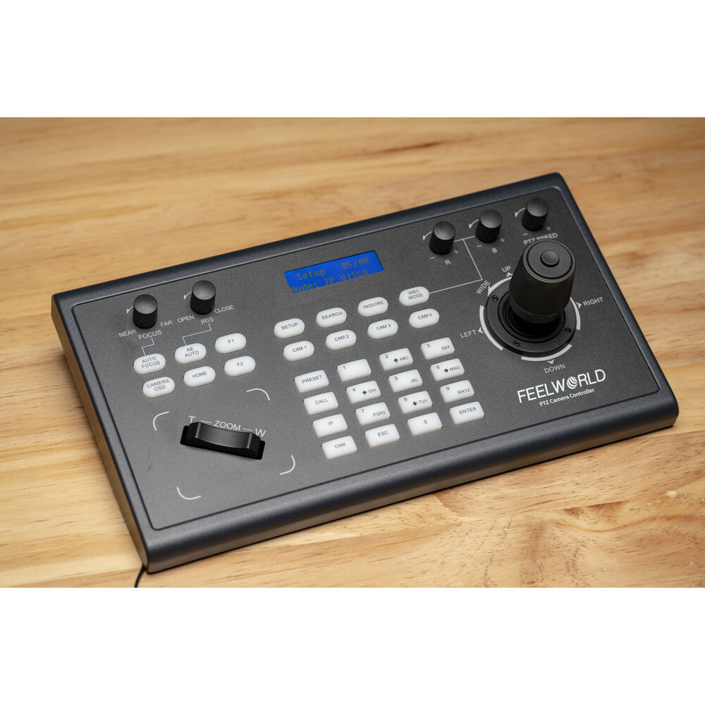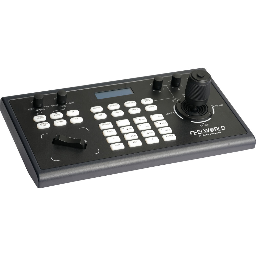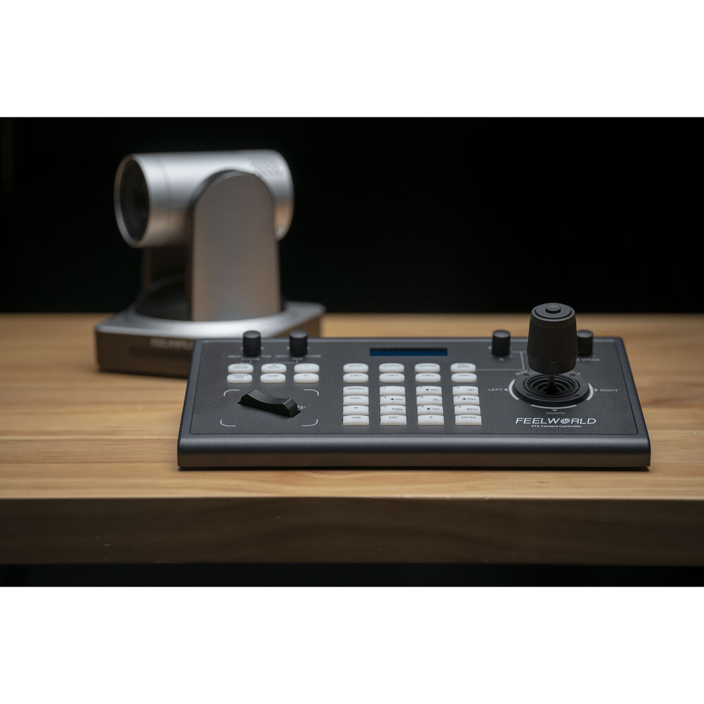 El controlador de cámaras PTZ KBC10 de FeelWorld con joystick es compatible con cualquier cámara PTZ que utilice los protocolos serie ONVIF, IP VISCA, VISCA y Pelco-D/P. Se puede configurar a través de los puertos de terminal Ethernet, RS-232 DB-9 y RS-422 de 5 pines, y permite controlar hasta 255 cámaras. Puede controlar cámaras a través de cable de par trenzado desde una distancia de hasta 1200 metros.