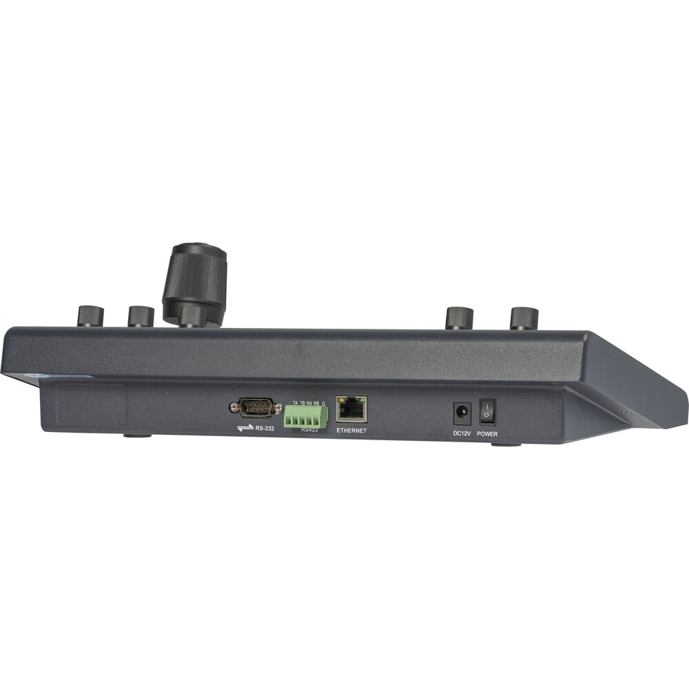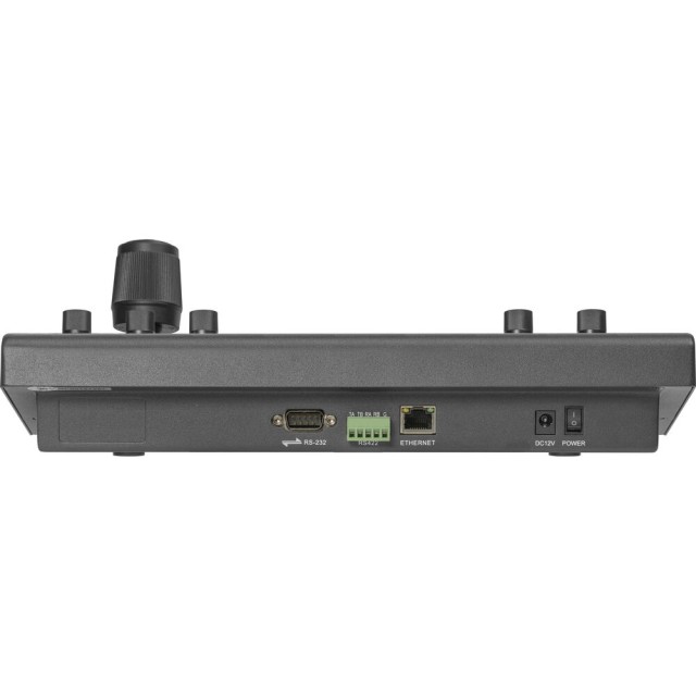 El panel de control está equipado con un joystick 4D, botones para seleccionar la cámara, un control de zoom tipo balancín, controles de enfoque, apertura y velocidad, y una pantalla LCD de estado. También dispone de botones programables para asignar atajos de usuario. El controlador se puede alimentar mediante el adaptador de corriente incluido o a través de PoE en una red compatible.