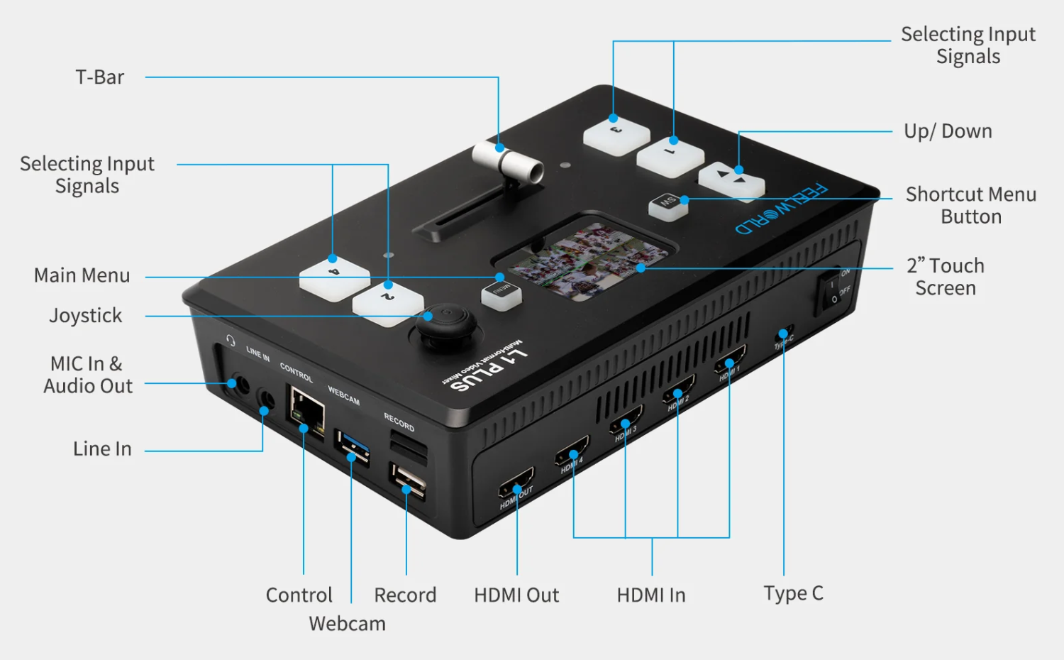 El L1 PLUS está diseñado para creadores de vídeo o cualquier persona que desee crear de forma sencilla y rápida programas con calidad de emisión y múltiples cámaras desde cualquier lugar. Puedes retransmitir en directo en YouTube, Facebook o Instagram, o utilizar Skype o Zoom para presentaciones comerciales innovadoras, controlar fácilmente cada pantalla mediante una cámara PTZ y guardar hasta 8 escenas para cambiar rápidamente entre ellas. Lo mejor de todo es que el L1 PLUS es «plug and play», no necesitas ser un profesional del vídeo para conseguir resultados espectaculares.
