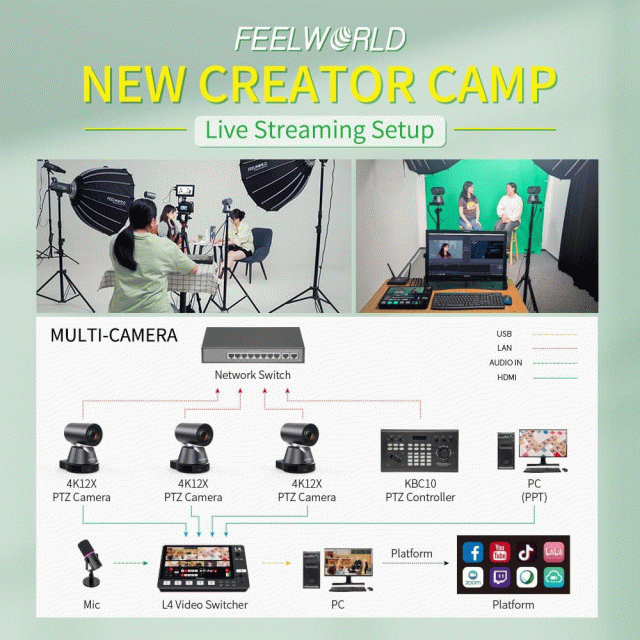 También puede controlar hasta 8 cámaras PTZ en la aplicación (Feelworld Live) a través del conmutador PoE, lo que resulta ideal para profesionales del sector audiovisual y de TI que necesitan gestionar de forma remota varias cámaras PTZ en su red.