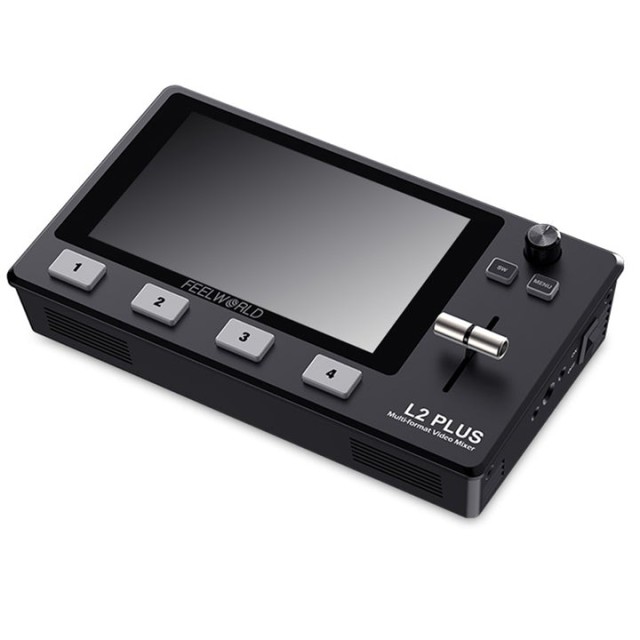 Feelworld L2 Plus es una compacta mesa de regiduría de cuatro canales con resolución 1080 HD y función de streaming, que cuenta con una pantalla LCD táctil integrada de 5,5 pulgadas, así como botones funcionales y una barra T-Bar para facilitar al máximo su manejo. El modelo L2 Plus se basa en la popular mesa de control LivePro L1 y ofrece una vista previa en tiempo real de la señal de 4 cámaras y de los buses PST/PGM; además, incluye control remoto de cámaras PTZ (protocolo Visca), croma, transmisión en directo (a YouTube/Facebook/Instagram o Skype/Zoom, etc.) y entrada de micrófono (conector de 3,5 mm)...