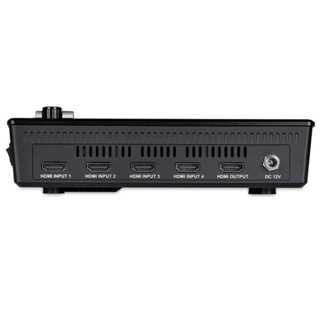 El panel superior de control cuenta con una pantalla LCD táctil de 5,5 pulgadas que muestra la señal de las 4 entradas HDMI y los buses PST y PGM para gestionar, por ejemplo, presentaciones sin necesidad de un monitor externo adicional. La pantalla permite no solo gestionar rápidamente programas en directo mediante el tacto, sino también navegar por el menú del dispositivo. Por supuesto, también cuenta con los botones físicos necesarios, incluyendo retroiluminación y el tradicional controlador T-Bar.