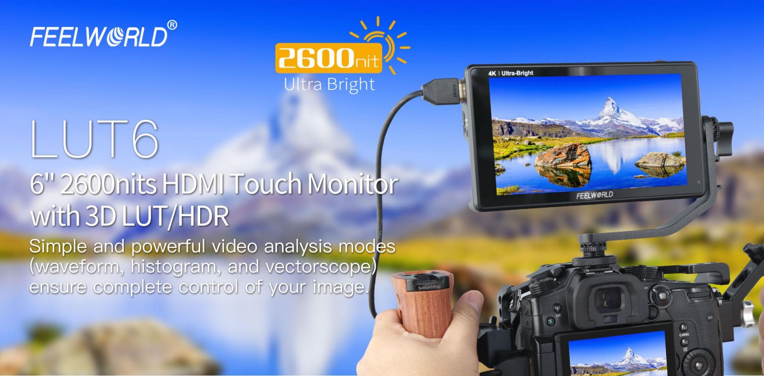 Monitor de cámara de 6" con alto brillo (2.600 cd/m²), pantalla táctil y compatibilidad con correcciones 3D LUT (presets integrados HLG 2020, HLG 709, HLG P3 HDR 3D LUT y Rec709 De-slog3/SLog2, SLog3, LogC, V-Log; o importación de hasta 50 archivos LUT propios mediante tarjeta SD). Se suministra con cable Mini/Micro HDMI-HDMI y soporte de montaje. Variante LUT6 con E/S HDMI 4K.