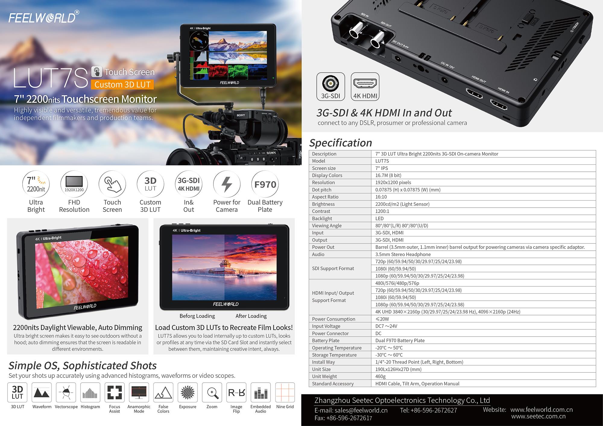 Monitor de cámara de 7" con alto brillo (2.200 cd/m², incluye sensor de luz ambiental para el ajuste automático del brillo), pantalla táctil y compatibilidad con correcciones 3D LUT (preset integrado «Log to Rec.709» o importación de archivos .cube personalizados). Se suministra con un cable Mini/Micro HDMI-HDMI y un soporte de montaje. Variante LUT7S con 4K HDMI y E/S 3G-SDI.