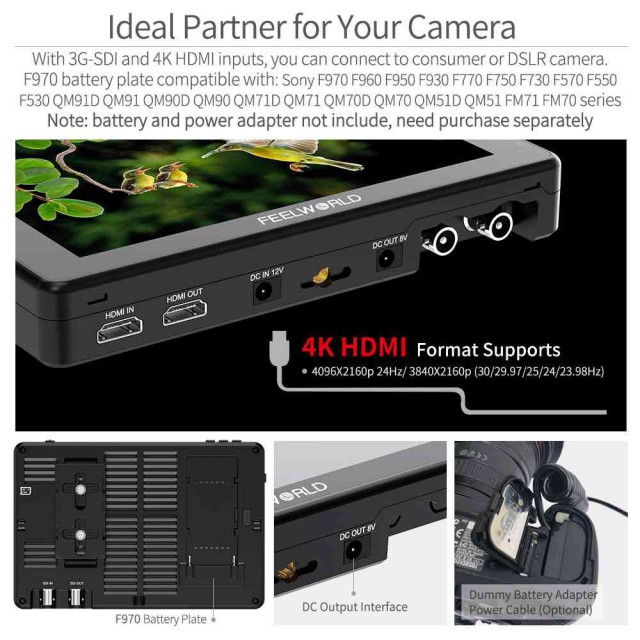 Entradas: HDMI 4K, 3G-SDI, 7-21 V=/2 A, ≤ 20 W