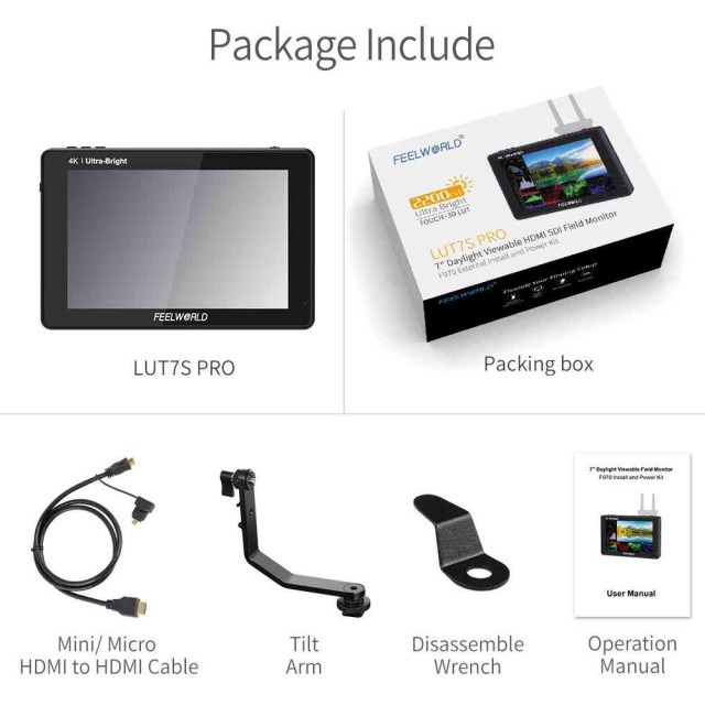Monitor de cámara de 7" con alto brillo (2200 cd/m², incluye sensor de luz ambiental para el ajuste automático del brillo), pantalla táctil y compatibilidad con correcciones 3D LUT (preset integrado «Log to Rec.709» o importación de archivos .cube personalizados). Se suministra con un cable Mini/Micro HDMI-HDMI y un soporte de montaje. La variante LUT7S Pro cuenta con E/S 4K HDMI y 3G-SDI, así como la posibilidad de instalar y alimentar otros accesorios (por ejemplo, transmisores/receptores inalámbricos) y dispone de una ranura para baterías de la serie L.