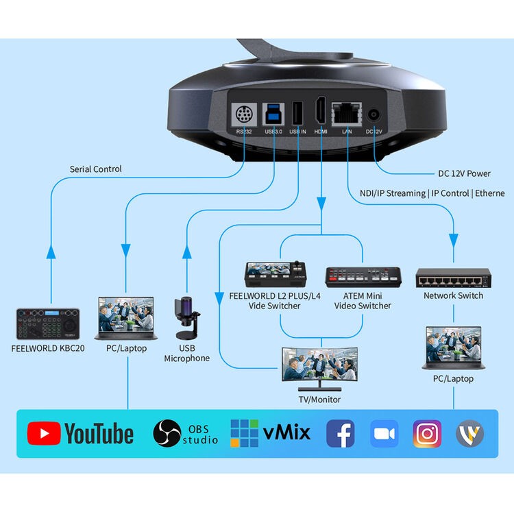 La Feelworld NDI10X es una cámara PTZ compacta 4K NDI HX2 diseñada para retransmisiones en directo profesionales, formación, conferencias y servicios religiosos. Está equipada con un sensor CMOS de 1/2,8″, zoom óptico de 10×, seguimiento automático con soporte de IA y salida simultánea por HDMI, USB e IP. Ofrece vídeo de alta calidad con baja latencia, control flexible y compatibilidad con PoE.