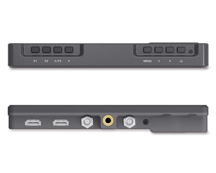 ...gracias a los botones situados en el borde superior de la pantalla, incluidos los funcionales, a los que se puede asignar cualquier función, por ejemplo, asistencia al enfoque, visualización en colores falsos, etc. El borde inferior cuenta con una rosca estándar de 1/4"-20 para montar el monitor en rigs de DSLR/DSLM/cámaras o directamente en las cámaras mediante el adaptador (incluido) para la zapata del flash; en el panel trasero tampoco faltan las roscas de montaje del estándar VESA con una distancia entre ejes de 75 mm.
